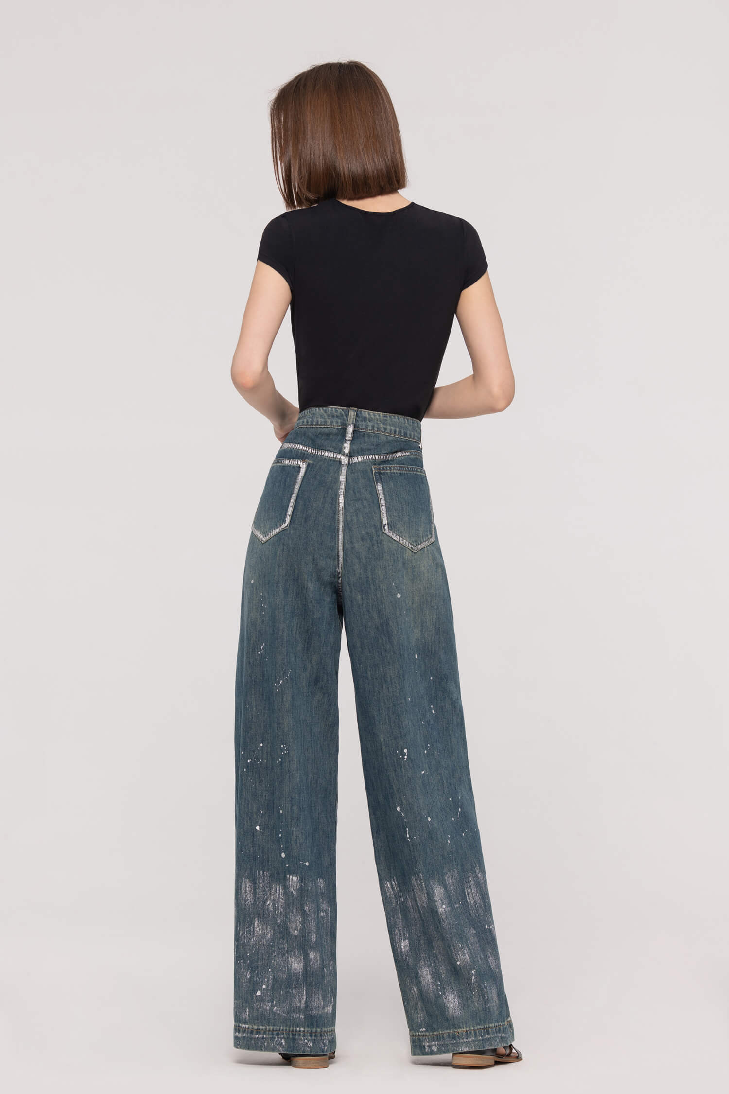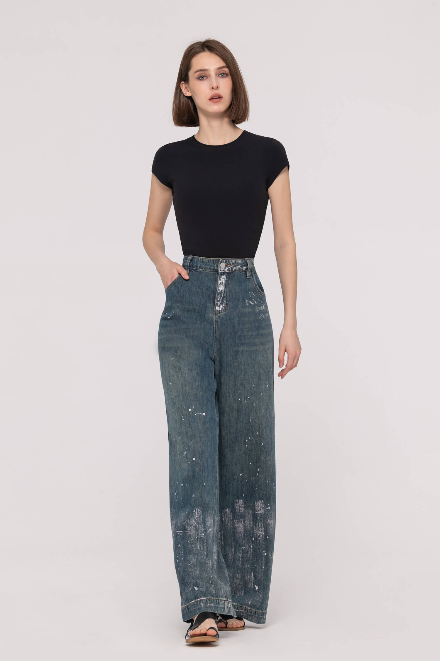 These eye-catching high-waist wide-leg jeans feature a dazzling foil print and leg-elongating silhouette that flatters every figure. Perfect for making an entrance at parties or turning heads at weekend brunch, they keep you comfortably dancing all night while feeling as confident as you look.